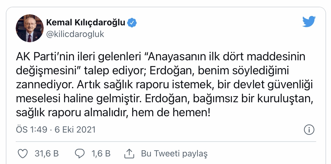 Kılıçdaroğlu şunları söyledi: AK Parti’nin ileri gelenleri “Anayasanın ilk dört maddesinin değişmesini” talep ediyor; Erdoğan, benim söylediğimi zannediyor. Artık sağlık raporu istemek, bir devlet güvenliği meselesi haline gelmiştir. Erdoğan, bağımsız bir kuruluştan, sağlık raporu almalıdır, hem de hemen!