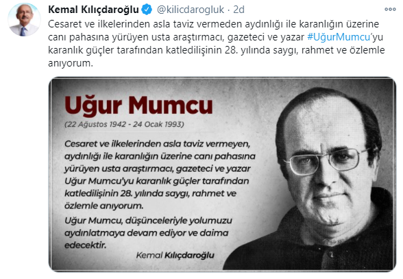 Kılıçdaroğlu, “Cesaret ve ilkelerinden asla taviz vermeden aydınlığı ile karanlığın üzerine canı pahasına yürüyen usta araştırmacı, gazeteci ve yazar #UğurMumcu’yu karanlık güçler tarafından katledilişinin 28. yılında saygı, rahmet ve özlemle anıyorum.” ifadelerini kullandı.