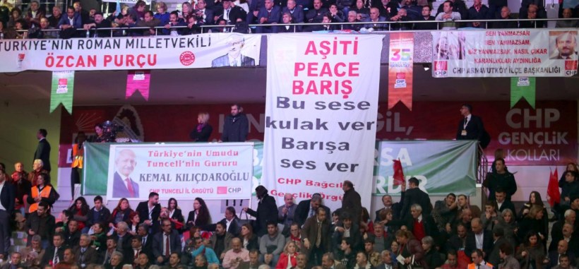 Salonda göze çarpan döviz ve pankartların yanı sıra, CHP’nin eski genel başkanlarının portre fotoğrafları da asılı. CHP yönetiminin belirlediği ve onayladığı pankart ve dövizlerin kaldırılması yapılan anonslarla isteniyor. Salonda; ‘Aşiti peace barış. Bu sese kulak ver barışa ses ver’ ve tutuklu gazeteciler Can Dündar ve Erdem Gül için asılan pankart dikkat çekti.. ‘Savaşın değil, barışın partisiyiz’, ‘Demokrasiyi biz getirdik, biz yücelteceğiz’, ‘Özgür basın varsa, özgür toplum vardır’ yazılı pankartlar var.