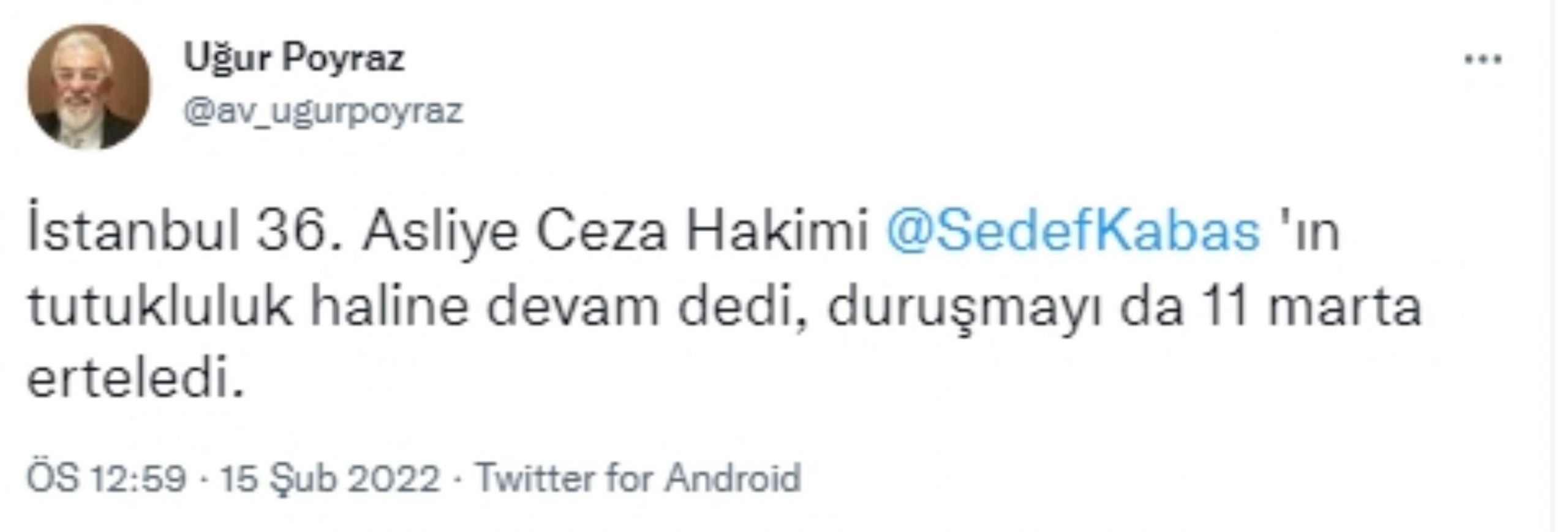 Sedef Kabaş’ın avukatı Uğur Poyraz’ın Twitter hesabından yaptığı açıklamaya göre, tutukluluk haline itirazda bulunulan Sedef Kabaş’la ilgili İstanbul 36. Asliye Ceza Mahkemesi’nden ret yanıtı geldi.