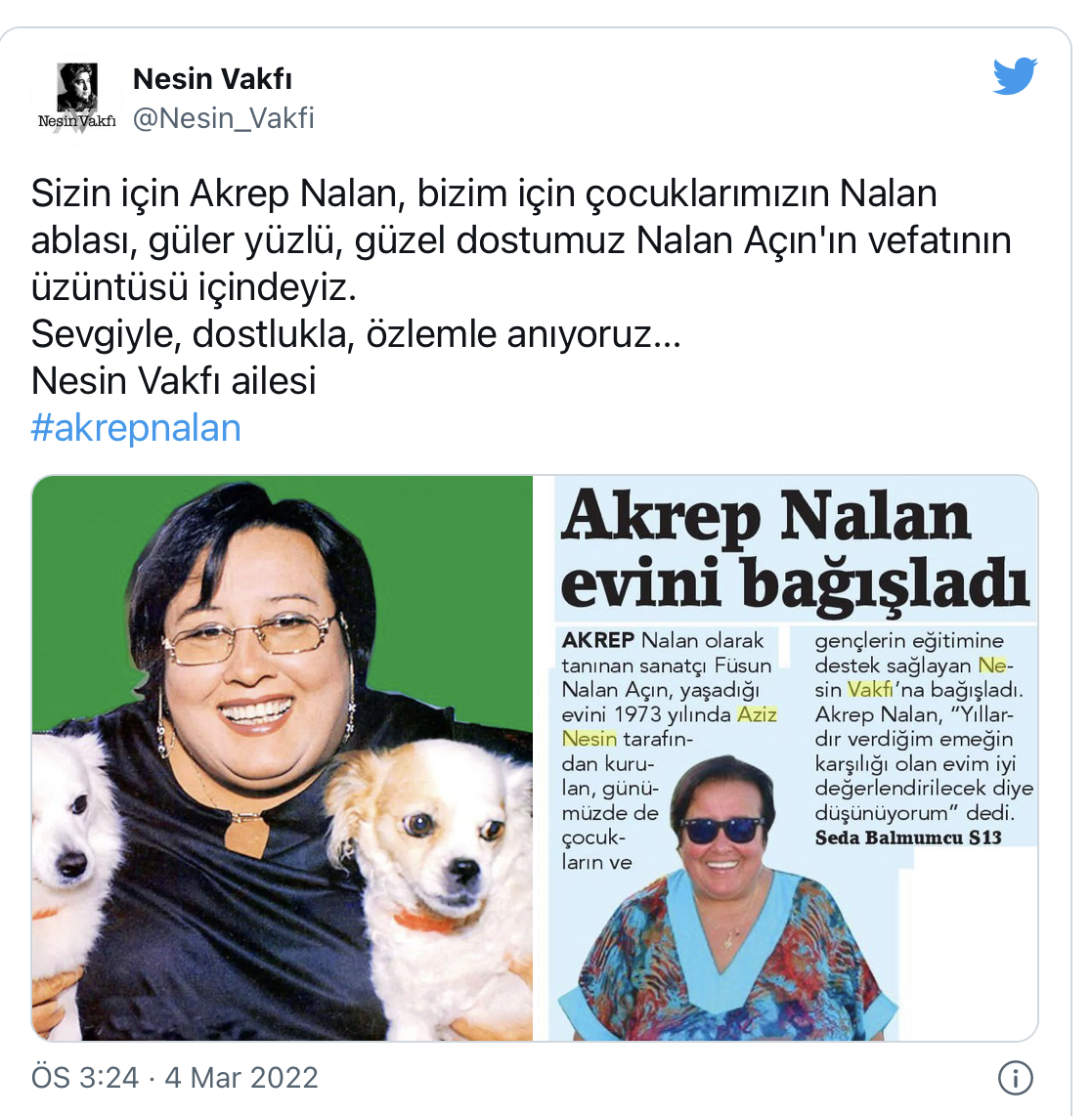 Akrep Nalan etiketi, Twitter Türkiye gündeminde ilk sıraya yükselirken, 1973 yılında yazar Aziz Nesin tarafından kurulan Nesin Vakfı da sanatçı için bir paylaşım yaptı. Paylaşımda, sanatçının mal varlığını Nesin Vakfı’na bağışladığı hatırlatıldı.