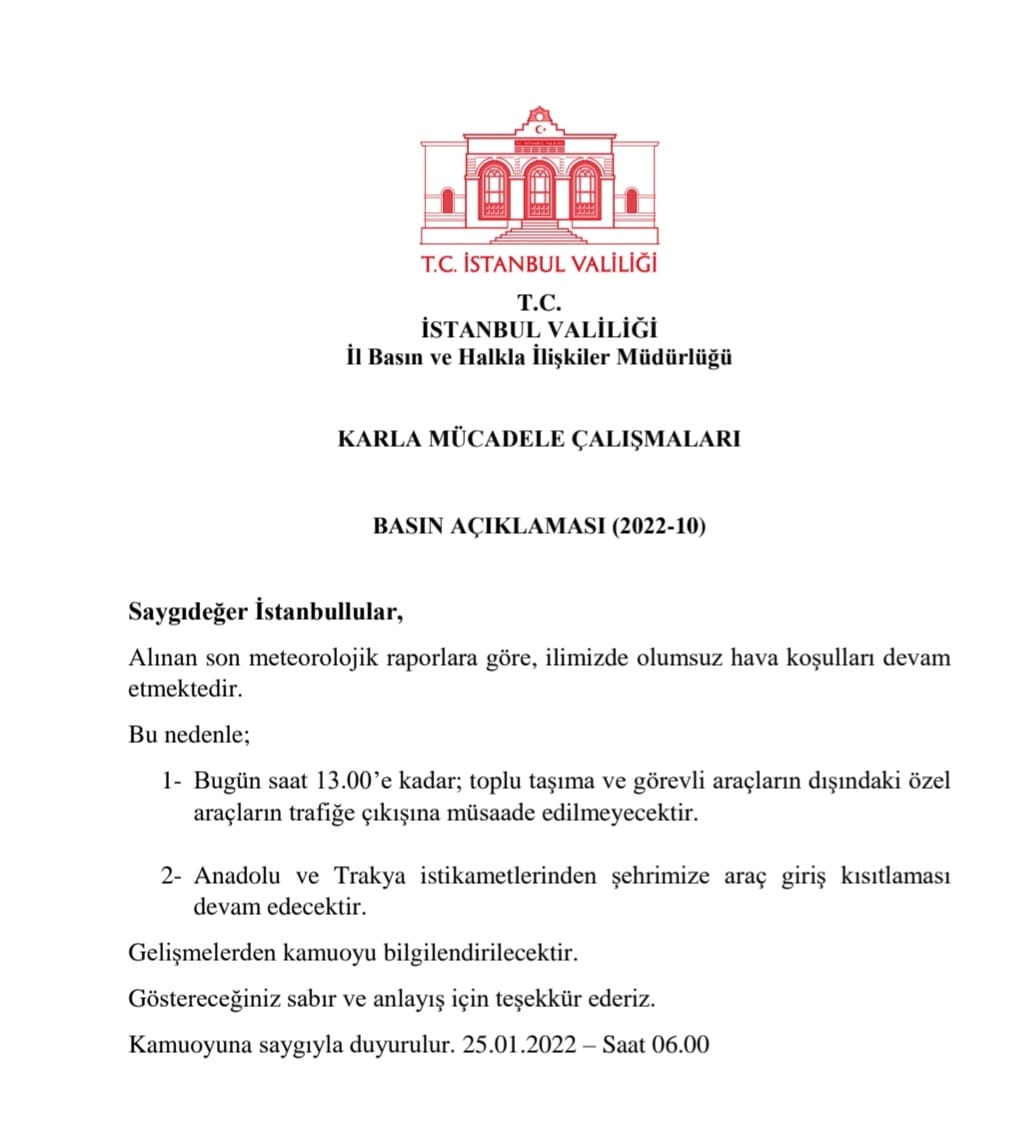 Özel araçların trafiğe çıkışları saat 13.00’e kadar yasaklandı. Vali Yerlikaya Twitter hesabından yaptığı açıklamada, “Saygıdeğer İstanbullular, Alınan son meteorolojik raporlara göre, ilimizde olumsuz hava koşulları devam etmektedir.