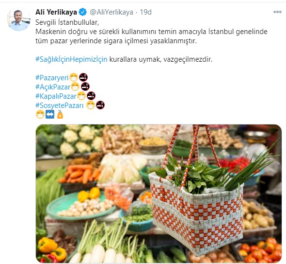 “Sevgili İstanbullular, maskenin doğru ve sürekli kullanımını temin amacıyla İstanbul genelinde tüm pazar yerlerinde sigara içilmesi yasaklanmıştır. #SağlıkİçinHepimizİçin kurallara uymak, vazgeçilmezdir.”