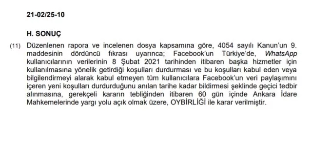 Rekabet Kurulu, Facebook’un Türkiye’de, WhatsApp kullanıcılarının verilerinin 8 Şubat 2021 tarihinden itibaren başka hizmetler için kullanılmasına yönelik getirdiği koşulları durdurması ve bu koşulları kabul eden veya bilgilendirmeyi alarak kabul etmeyen tüm kullanıcılara Facebook’un veri paylaşımını