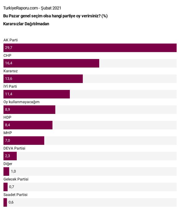 İstanbul Ekonomi Araştırma Genel Müdürü Can Selçuki, sosyal medya hesabı üzerinden Şubat 2021 anket sonuçlarını paylaştı. Kararsızlar dağıtılmadan ‘AKP’ye oy veririm diyenlerin oranı ise yüzde 30’un altına düştü.