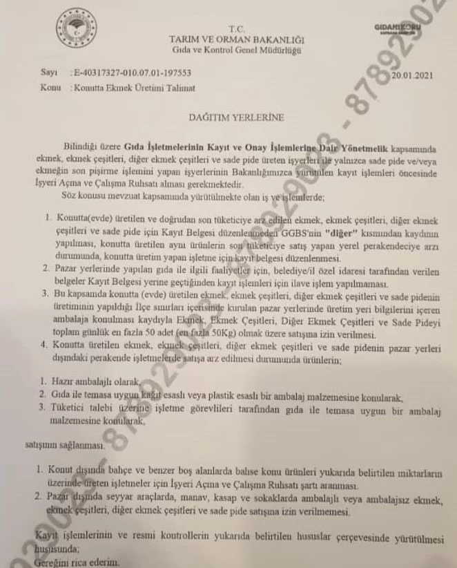 Tarım ve Orman Bakanlığı‘nın yayımladığı 21 Ocak 2021 tarihli genelgede, mobil araçlarda ekmek satışı yasaklandı.