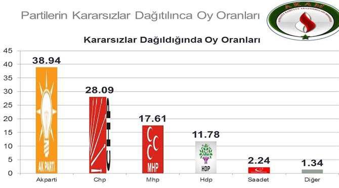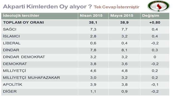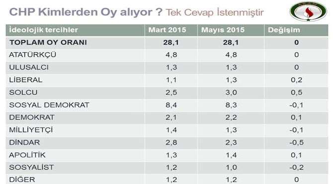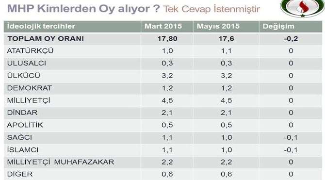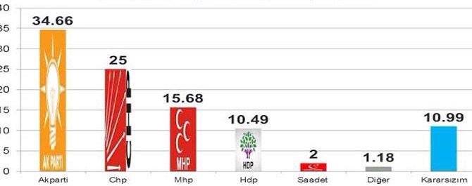 Şirketler, CHP’nin oylarını, yüzde 25.8 ile 30.1 arasında gösterdi. MHP’nin oylarının da yüzde 16-18 arasında olduğu açıklandı. SP-BBP ittifakı yüzde 4 oya kadar çıkarken, MHP’ye son günlerde AKP seçmeninden oy kaydığı belirlendi. AKP’nin çok güçlü olduğu MHP’nin ise 2. sırada bulunduğu Yozgat gibi bazı illerde ise, CHP seçmeninin MHP’ye yöneleceği belirlendi.