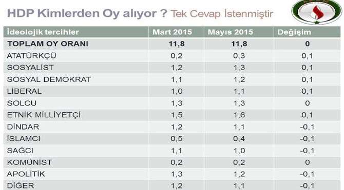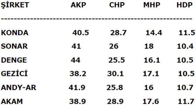 Kamuoyu araştırma şirketleri KONDA, SONAR, DENGE, GEZİCİ, AKAM ve ANDY-AR’ın anketlerinden birbirine yakın sonuçlar çıktı. Altı şirket de, HDP’nin barajı aştığını ve oylarının 10.4 ile 11.5 arasında olduğunu ortaya koydu.