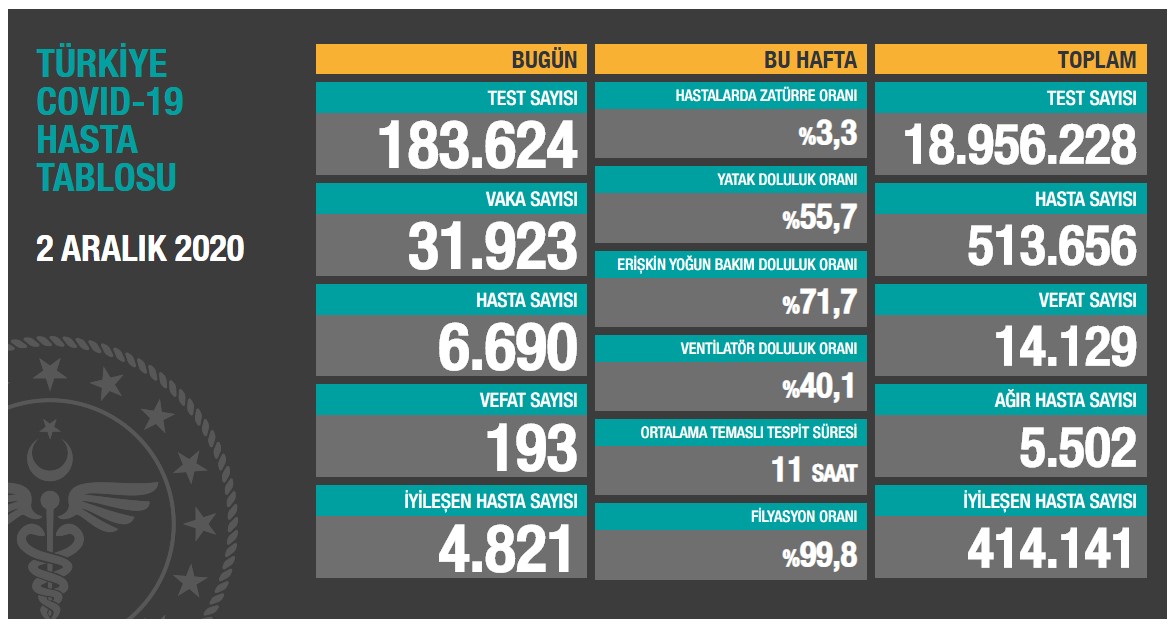 Türkiye’nin 2 Aralık 2020 güncel koronavirüs tablosu şöyle: