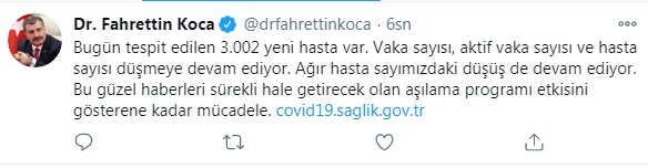 Twitter hesabından paylaşım yapan Fahrettin Koca, “Bugün tespit edilen 3.002 yeni hasta var. Vaka sayısı, aktif vaka sayısı ve hasta sayısı düşmeye devam ediyor. Ağır hasta sayımızdaki düşüş de devam ediyor. Bu güzel haberleri sürekli hale getirecek olan aşılama programı etkisini gösterene kadar mücadele.” ifadelerini kullandı.