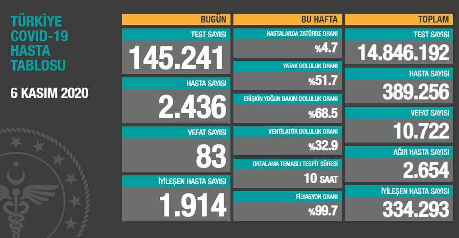 Sağlık Bakanı Fahrettin Koca, Türkiye’nin 6 Kasım 2020 karonavirüs tablosunu açıkladı. Yapılan açıklamaya göre Türkiye’de 6 Kasım’da 83 kişi daha hayatını kaybetti.