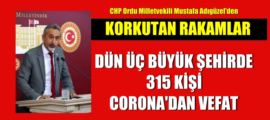 Üç büyük şehirde 315 kişi coronadan vefat etti: Mustafa Adıgüzel, dün itibariyle İstanbul, İzmir ve Ankara’da bulaşıcı hastalık nedeniyle vefat edenlerin sayısının 315 olduğunu öne sürdü. Aynı zamanda tıp doktoru olan Adıgüzel, pandemi boyunca ise bu üç ilde toplamda ölüm sayısının ise 16 bin 610 kişiye ulaştığını ifade etti.