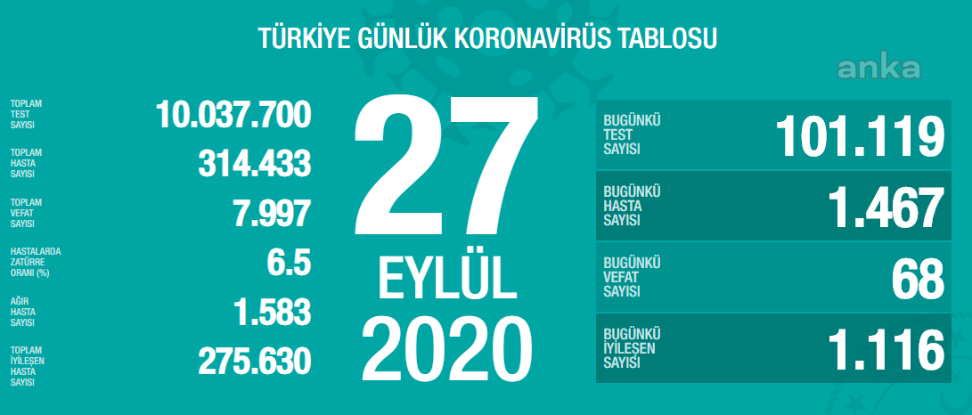 Bakan Koca’nın paylaştığı verilere göre; son 24 saat içerisinde yapılan 101 bin 119 yeni testten 1467 kişiye koronavirüs tanısı konuldu. Virüs nedeniyle bugün 68 kişi daha yaşamını yitirirken 1116 kişi de iyileşti.