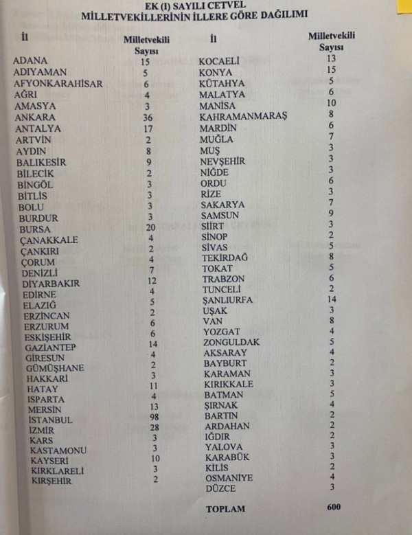 600 milletvekili koltuğu bulunan TBMM’de yapılan düzenlemenin ardından İstanbul’un 97 olan milletvekili sayısı 98’e, Bayburt ise 1’den 2’ye yükseldi.