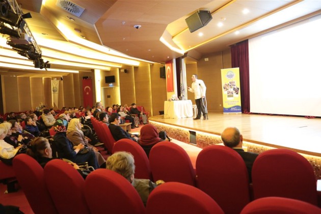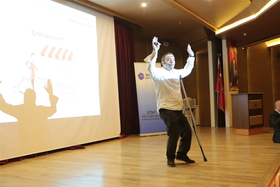 “Umudum ve hayallerim beni bu mikrofona ve sahneye getirdi, hayatımda pes etmek yok” diyerek sunumuna başlayan İletişim Uzmanı Mehmet Kızıltaş, engelli olarak kendisinin yaşadığı zorlukları ve duyguları anlattı. Salonda bulunan vatandaşlara algı, farkındalık, empati gibi kelimelerin anlamını tanımlamalarını isteyen Kızıltaş, aynı zamanda katılımcılara engelli oranı yüzde kaçtır? Engellilik kimleri etkiler? Bakışların etkisi nedir? gibi sorular sordu.