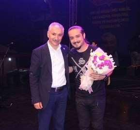 Kâzım Koyuncu’yu anma gecesine tulum ve kemençe ezgileriyle ve söylediği birbirinden güzel türküleriyle renk katan Aydoğan Topal’a teşekkür çiçeğini Sarıyer Belediye Başkan Yardımcısı İsmail Erdem verdi. Erdem, Topal ve saz ekibine katılımlarından ötürü teşekkür etti.